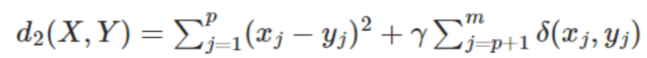 - 右辺の第1項は量的データから計算されるユークリッド距離、第2項が質的データから計算されるシンプルマッチング非類似度で、第2項の係数γが量的データと質的データの非類似度の重みを決めるパラメータ