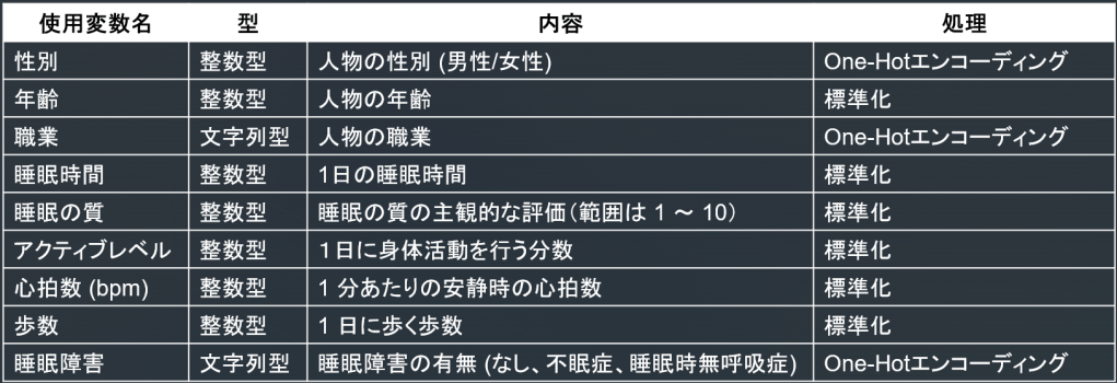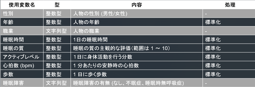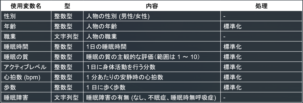 こちらは400人の健康/生活習慣の調査データで、数値情報(年齢、睡眠時間など)に加え、性別や職業、睡眠症状(不眠症/無呼吸症候群等)といったカテゴリカル変数も含まれている混合データだったためこちらを使うことにします。