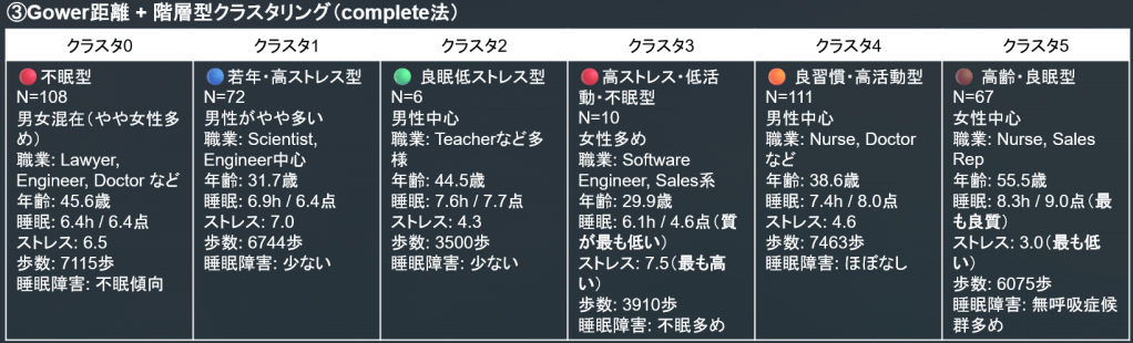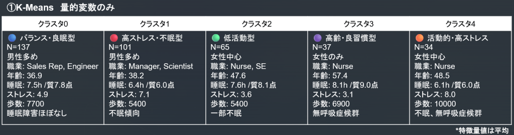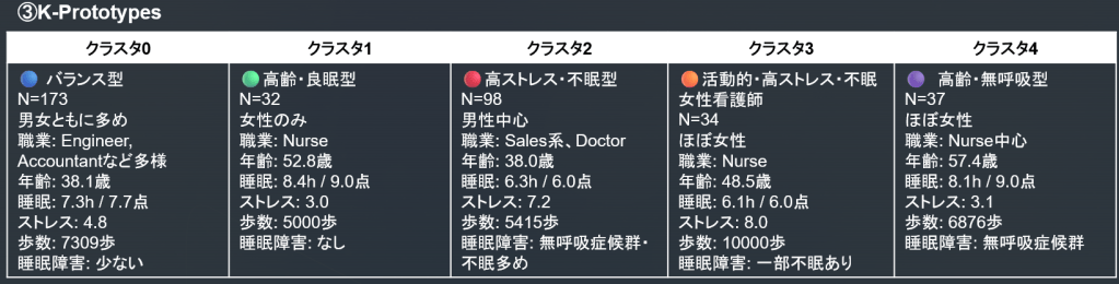 - クラスタ1の男性/管理職サイエンティスト中心の不眠群や、クラスタ4の看護師の高活動高ストレス不眠群など、想像に難くない人々が浮き上がっています。