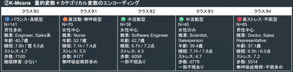 - クラスタ0, 1は良生活習慣で、クラスタ2, 3は高ストレスの不眠、クラスタ4は女性看護師の長い睡眠無呼吸症候群になっています。