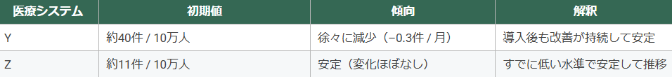 ITSは、介入前後での「傾き」と「水準」の変化を分離して評価できる時系列解析手法です。
