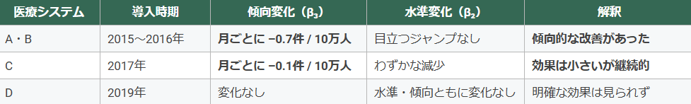 ランダム化試験が難しい状況において、ITSは観察データのみで、因果的な示唆を得るアプローチとして注目されているようです。今回の研究ではZSプログラム導入を介入とし、その後の傾向をβ₃で、水準変化をβ₂で推定しています。