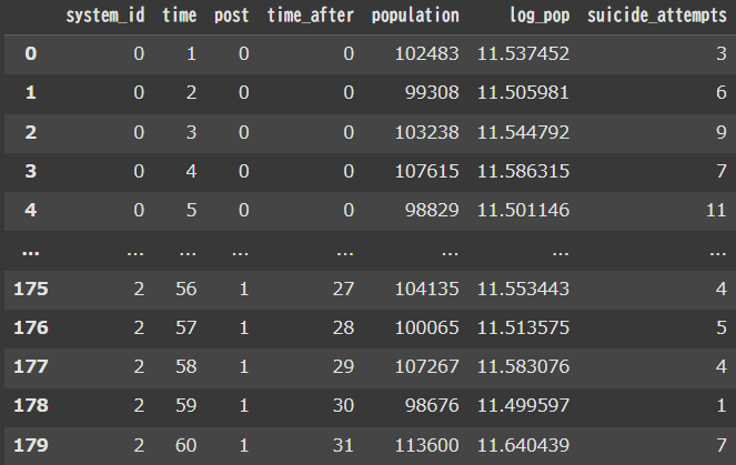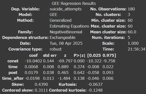 - time_after(介入後の傾向変化)の係数coefは -0.0198 であり、これは介入後に目的変数(自殺未遂率など)がわずかに減少傾向になったことを示唆する。