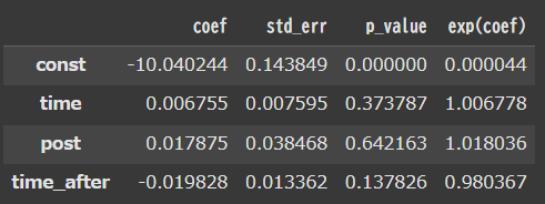 X = sm.add_constant(df[['time', 'post', 'time_after']])